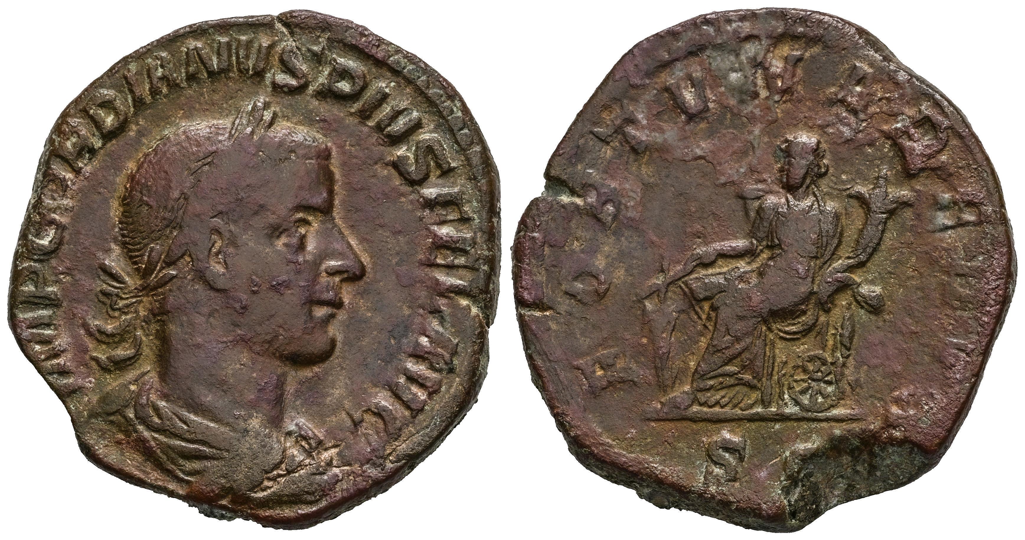 Gordian III. Sestertius. 244 AD. Rome. (Ric-IV 331a). Anv.: IMP GORDIANVS PIVS FEL AVG, laureate, draped and cuirassed bust to right. Rev.: FORTVNA REDVX, Fortuna seated to left, holding rudder set on ground and cornucopiae, wheel under seat; SC in exergue. Ae. 19,53 g. Almost VF. Est...70,00.