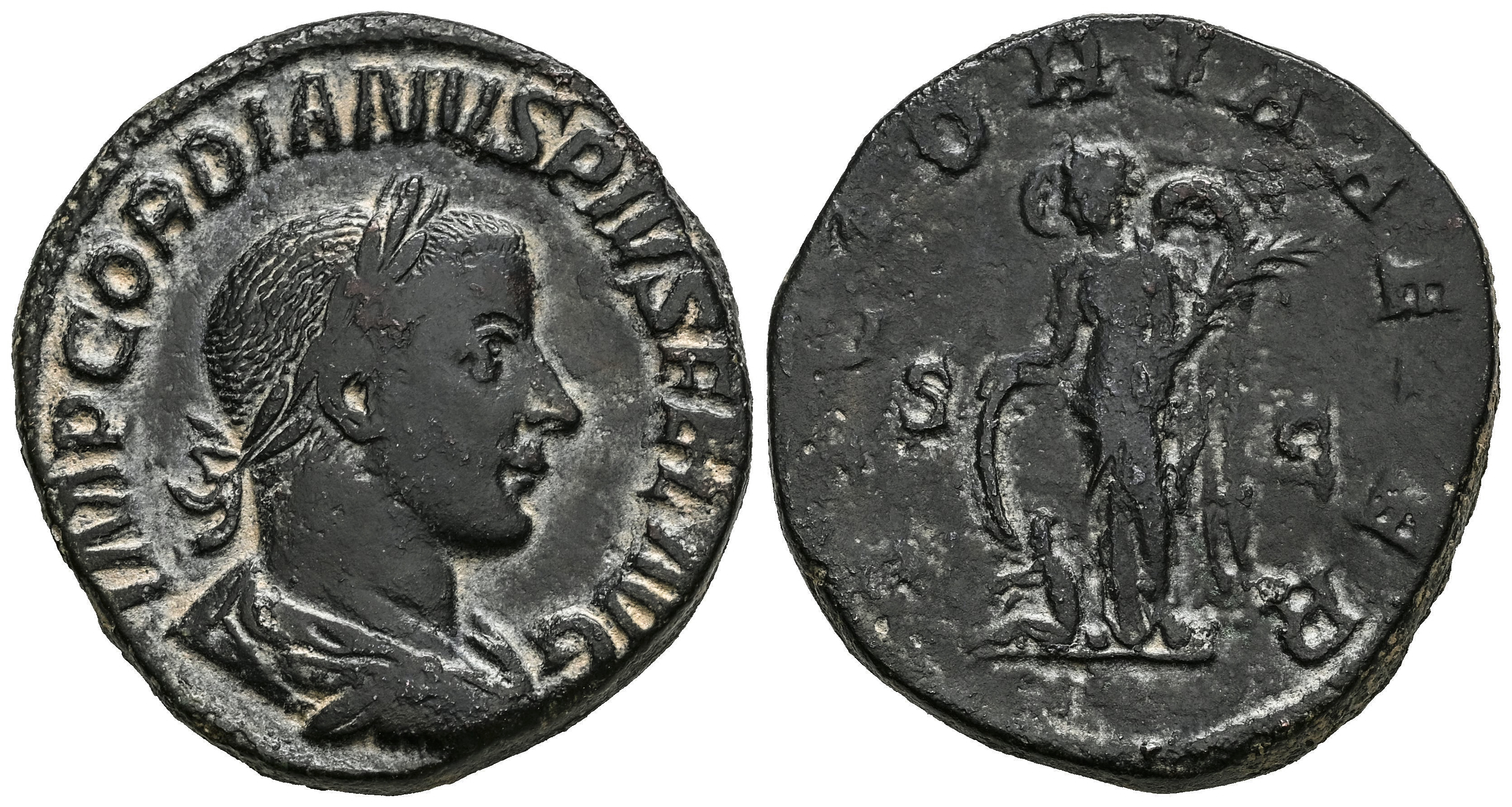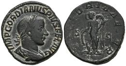 Gordian III. Sestertius. 241-244 AD. Rome. (Ric-IV 337a). (Banti-105). (C-351). Anv.: IMP GORDIANVS PIVS FEL AVG, laureate, draped and cuirassed bust to right. Rev.: VICTORIA AETER, Victory standing facing, head to left, holding palm and leaning on shield, under which is a captive; S-C across fields. Ae. 19,45 g. Artificial patina. Almost VF. Est...70,00.