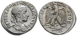 Gordian III. Seleucis and Pieria. Tetradrachm. 242-244 AD. Antioch. (Prieur-302). (McAlee-874). Anv.: AYTOK K M ANT ΓOPΔIANOC CЄB, Laureate, draped and cuirassed bust to right, seen from behind. Rev.: ΔHMAPX ЄΞ VΠA TO B, Eagle standing facing, head and tail left, with wings spread and wreath in beak; between legs, crescent and ram running to right, head to left. Bi. 12,52 g. Slight rust. Choice VF/Almost XF. Est...100,00.