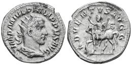 Philip I. Antoninianus. 244-247 AD. Rome. (Ric-IV 26b). (Rsc-3). Anv.: IMP M IVL PHILIPPVS AVG, radiate, draped and cuirassed bust to right. Rev.: ADVENTVS AVGG, Emperor, on horseback, pacing to left, holding spear and raising hand. Ag. 4,33 g. VF. Est...40,00.