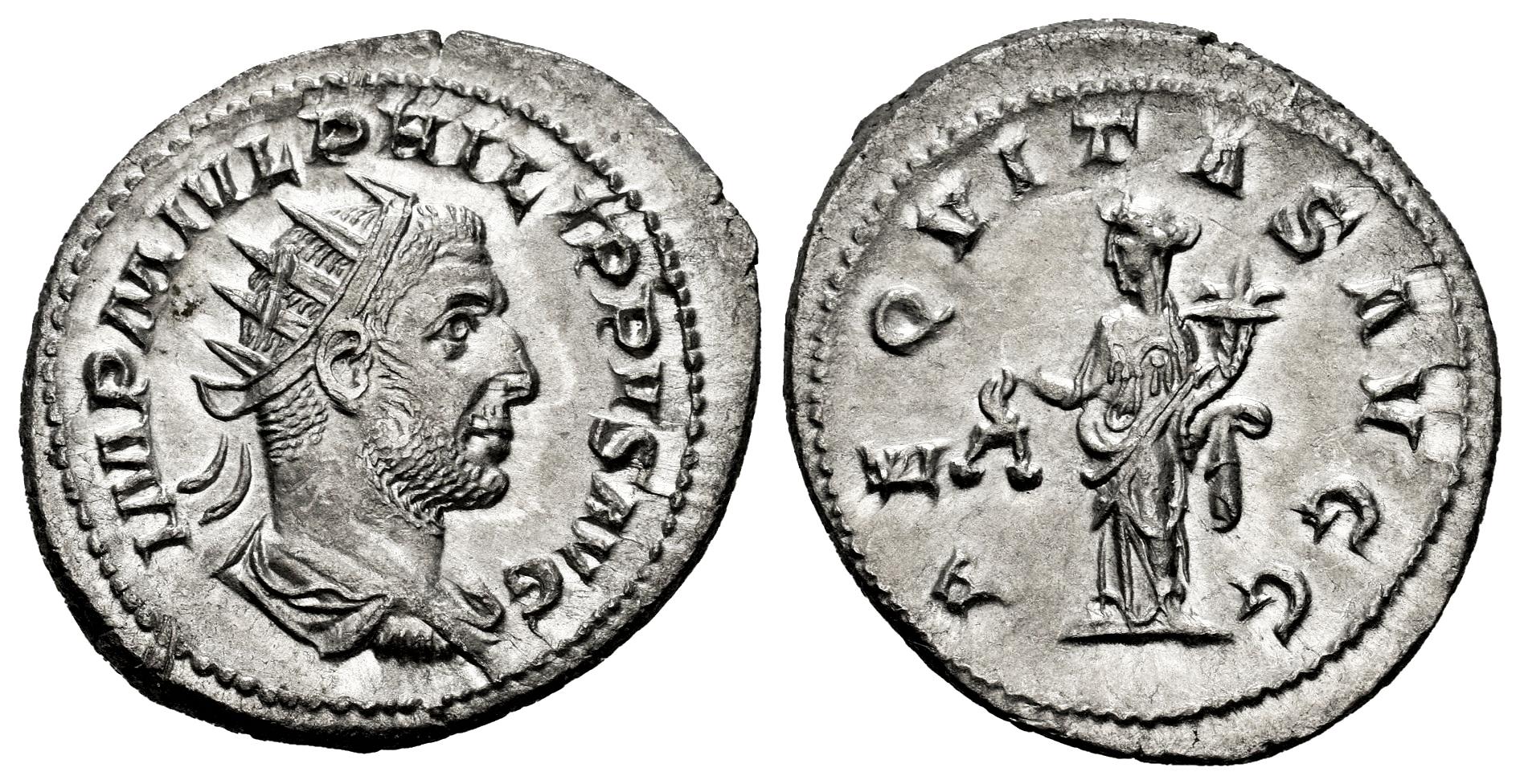 Philip I. Antoninianus. 244-247 AD. Rome. (Ric-IV 27b). (Rsc-9). Anv.: IMP M IVL PHILIPPVS AVG, radiate, draped and cuirassed bust to right. Rev.: AEQVITAS AVGG, Aequitas standing facing, head to left, holding scales and cornucopiae. Ag. 4,68 g. A good sample. Original luster. Ex CNG Coin shop 877915. AU. Est...100,00.