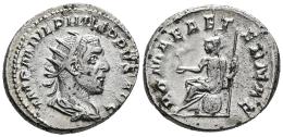 Philip I. Antoninianus. 244-247 AD. Rome. (Ric-IV 44b). (Rsc-169). Anv.: IMP M IVL PHILIPPVS AVG, radiate, draped and cuirassed bust to right. Rev.: ROMAE AETERNAE, Roma seated to left, holding Victory and sceptre, shield at side. Ag. 5,14 g. VF/Choice VF. Est...45,00.