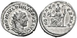 Philip I. Antoninianus. 244-247 AD. Rome. (Ric-IV 44b). (Rsc-169). Anv.: IMP M IVL PHILIPPVS AVG, radiate, draped and cuirassed bust to right. Rev.: ROMAE AETERNAE, Roma seated to left on shield, holding Victory and sceptre. Ag. 4,40 g. A good sample. Traces of luster. Ex Áureo & Calicó 452 (29/052025), lot 83. AU. Est...120,00.