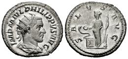 Philip I. Antoninianus. 244 AD. Rome. (Ric-IV 46b). (Rsc-206). Anv.: IMP M IVL PHILIPPVS AVG, radiate, draped, and cuirassed bust to right. Rev.: SALVS AVG, Salus standing to left, feeding from patera snake rising from altar and holding rudder. Ag. 4,77 g. Traces of luster. Ex Collection RW, Classical Numismatic Group 241 (29/09/2010), lot 475. XF/VF. Est...80,00.
