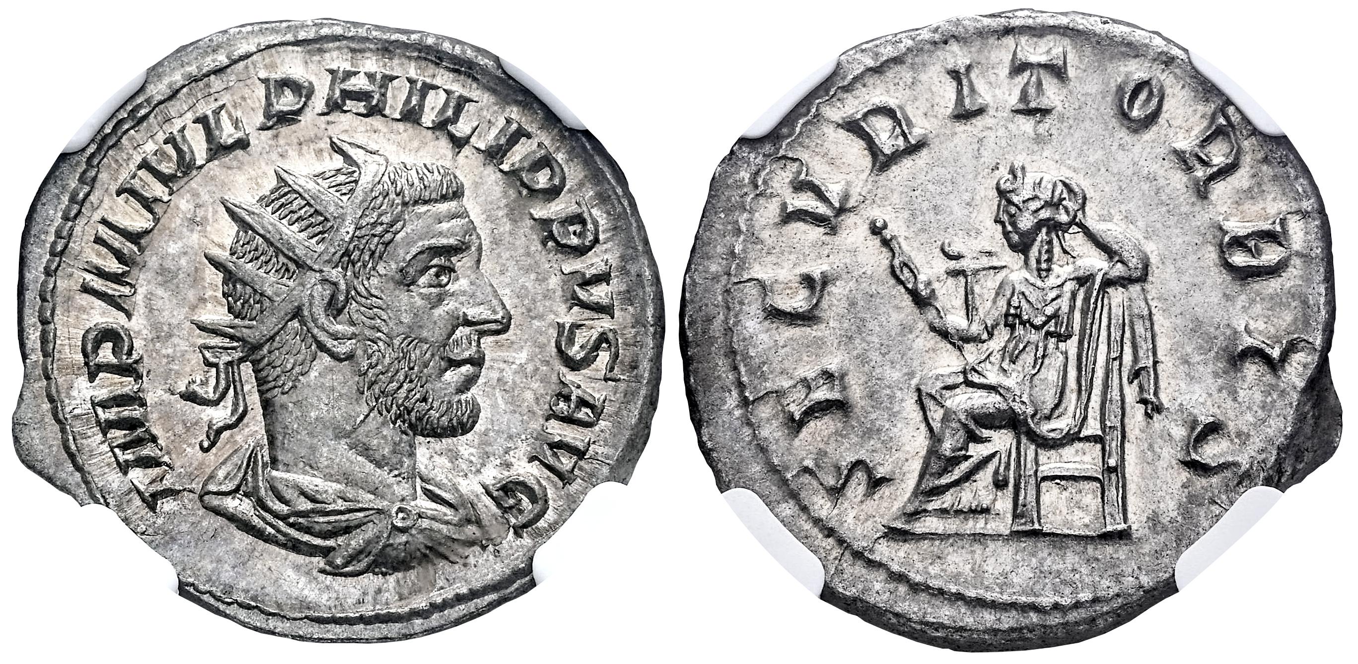 Philip I. Antoninianus. 244-247 AD. Rome. (Ric-IV 48b). (Rsc-215). Anv.: IMP M IVL PHILIPPVS AVG, radiate, draped and cuirassed bust to right. Rev.: SECVRIT ORBIS, Securitas seated to left, holding sceptre and propping head on hand. Ag. 4,86 g. Ex Artemide Aste LIX (07/05/2023), lot 669. Included original label. Slabbed by NGC as Ch AU, strike 5/5, surface 5/5. Est...150,00.