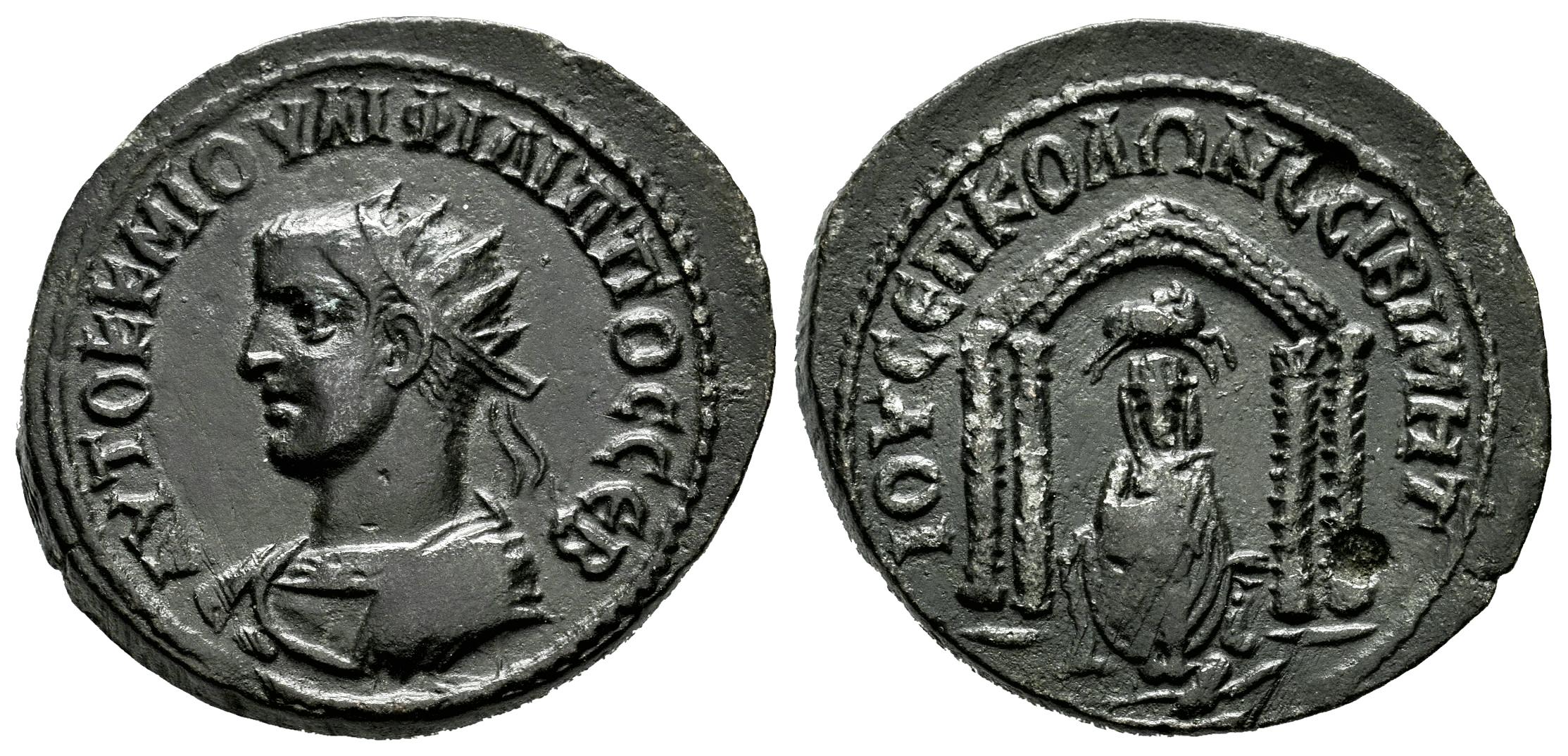 Philip II. AE 27. 247-249 AD. Nisibis, Mesopotamia. (RPC-VIII ID 2962). (Sng Cop-240). Anv.: AYTOK M IOVΛI ΦIΛIΠΠOC CЄB, radiate, draped and cuirassed bust to left. Rev.: IOY CЄΠ KOΛΩ NЄCIBI MHT, Tyche of Antioch seated facing; above, ram (Aries) leaping to right, head to left; all within tetrastyle shrine; below, river-god Euphrates swimming to right. Ae. Choice VF. Est...100,00.