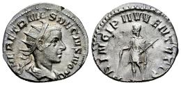 Herennius Etruscus. Antoninianus. 250-850 AD. Rome. (Ric-147c). (Rsc-26). Anv.: Q HER ETR MES DECIVS NOB C. Radiate and draped bust of Herennius Etruscus to right. Rev.: PRINCIPI IVVENTVTIS. Herennius standing front in military attire, head to left, holding baton in his right hand and spear in his left. Ag. 3,53 g. Almost XF. Est...60,00.