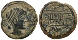 Obulco. Unit. 220-20 BC. Porcuna (Jaén). (Abh-1815 var.). (MIB-159/26u). Anv.: Female head right, legend OBVLCO before, crescent and iberian letter TA behind. Rev.: Plow right above, ear of corn to the right below, crescent to left above; between them, legend L. AIMIL/M. IVNI/ AID. Ae. 14,94 g. Rare. VF. Est...120,00.