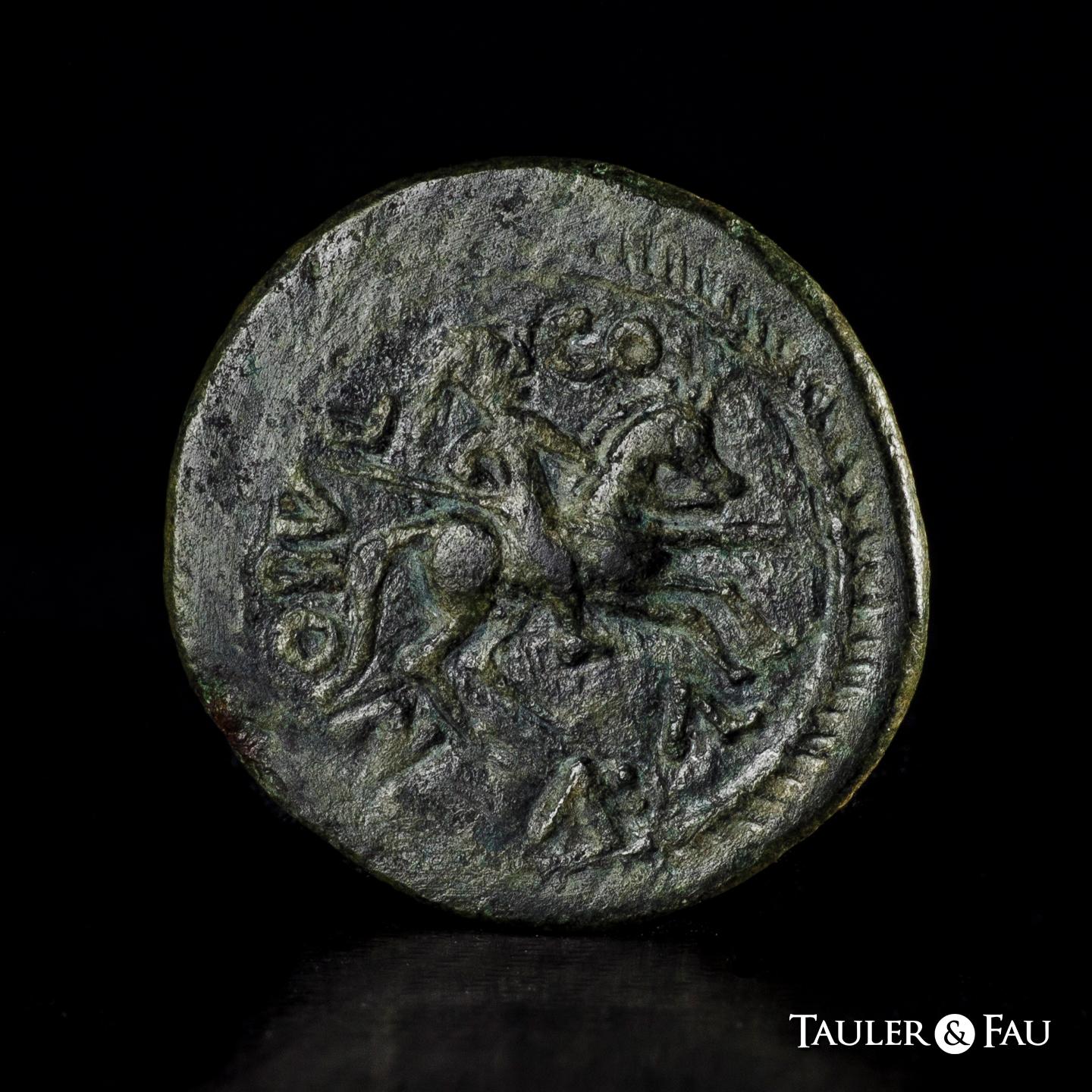 Obulco. Half unit. 220-20 BC. Porcuna (Jaén). (Abh-1829). (MIB-159/04). (Acip-2183). Anv.: Head of Apollo right within a laurel wreath, ILNO before. Rev.: Horseman right, holding spear, OBVLCO above, NAAL below. Ae. 8,22 g. Very scarce. Choice VF. Est...150,00.