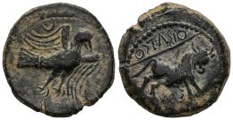 Obulco. Half unit. 220-20 BC. Porcuna (Jaén). (Abh-1849). (MIB-159/15c). (Acip-2241). Anv.: Eagle right, crescent above. Rev.: Bull right, legend OBVLCO from right to left. Ae. 6,97 g. A good sample. Rare in this condition. Choice VF. Est...150,00.