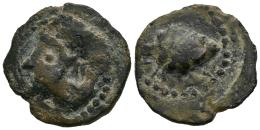Olontigi. Half unit. 50-20 BC. Aznalcázar (Sevilla). (Abh-1879). (MIB-24/04). (Acip-855). Anv.: Male head left. Rev.: Pine cone right, punic legend below. Ae. 4,10 g. Rare. Almost VF/VF. Est...120,00.