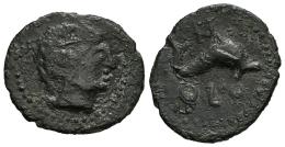 Olontigi. Cuadrante. 50-20 BC. Aznalcázar (Sevilla). (Abh-1885). (MIB-24/13). (Acip-867). Anv.: Male head right. Rev.: Dolphin right, legend OLO/NT starting from below. Ae. 1,54 g. Of the highest rarity. A few specimens known. Choice F. Est...120,00.