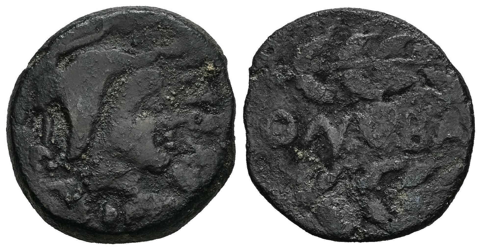 Onuba. Half unit. 50 BC. Huelva. (Abh-1896). (MIB-175/8). (Acip-2419). Anv.: Helmeted male head right, legend C. AELI. Q. PVBLILI around. Rev.: Two ears of corn left; between them, ONVBA. Ae. 3,41 g. Rare. Choice F. Est...120,00.