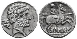 Bolskan. Denarius. 180-20 BC. Huesca. (Abh-1911). (MIB-79/07a). Anv.: Bearded head right, iberian letters BON behind. Rev.: Horseman right, holding spear, iberian legend BOLSKAN below. Ag. 3,74 g. Choice VF. Est...120,00.