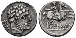 Bolskan. Denarius. 180-20 BC. Huesca. (Abh-1911). Anv.: Bearded head right, iberian letters BON behind. Rev.: Horseman right, holding spear, iberian legend BOLSKAN below. Ag. 3,75 g. Light patina. Ex Áureo&Calicó (28/04/2011), lot 1105. Choice VF. Est...150,00.