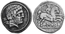Bolskan. Denarius. 180-20 BC. Huesca. (Abh-1911). (MIB-79/07a). Anv.: Bearded head right, iberian letters BON behind. Rev.: Horseman right, holding spear, iberian legend BOLSKAN below. Ag. 3,97 g. VF/Almost VF. Est...70,00.