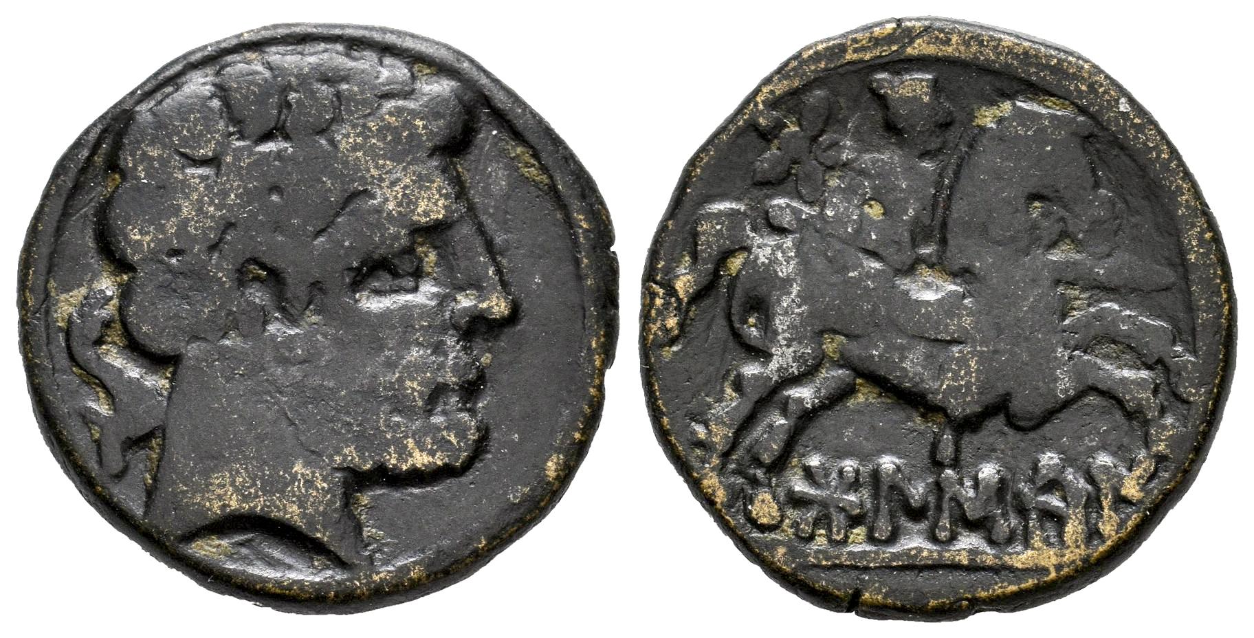 Bolskan. Unit. 180-20 BC. Huesca. (Abh-1918). (Acip-1419). Anv.: Bearded head right, dolphin behind. Rev.: Horseman right, holding spear, star above, iberian legend BOLSKAN below. Ae. 6,84 g. Choice F. Est...50,00.
