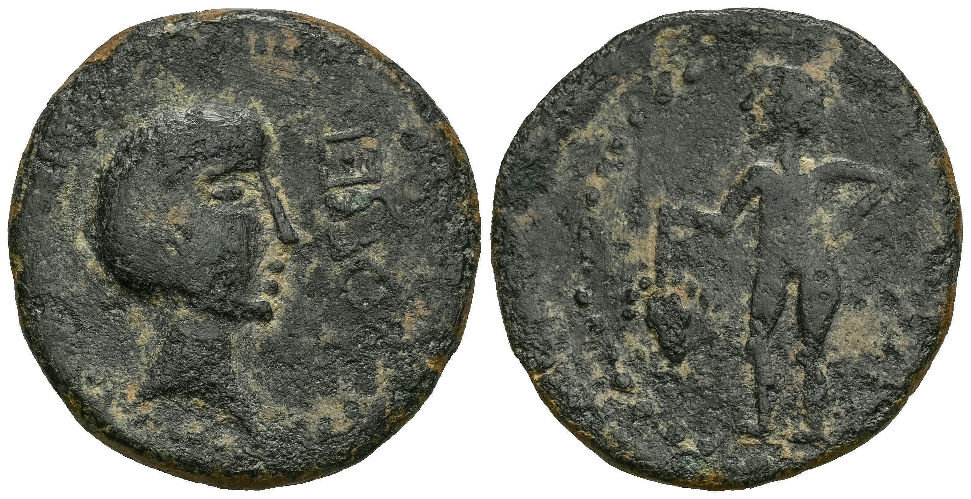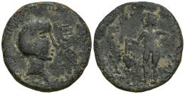 Osset. Unit. 120-20 BC. San Juan de Aznalfarache (Sevilla). (Abh-1949). (Acip-2470). (C-8). Anv.: Head of Augustus? right, OSSET before. Rev.: Genius standing left, holding a bunch of grapes. Ae. 9,42 g. Light series. Almost VF. Est...150,00.