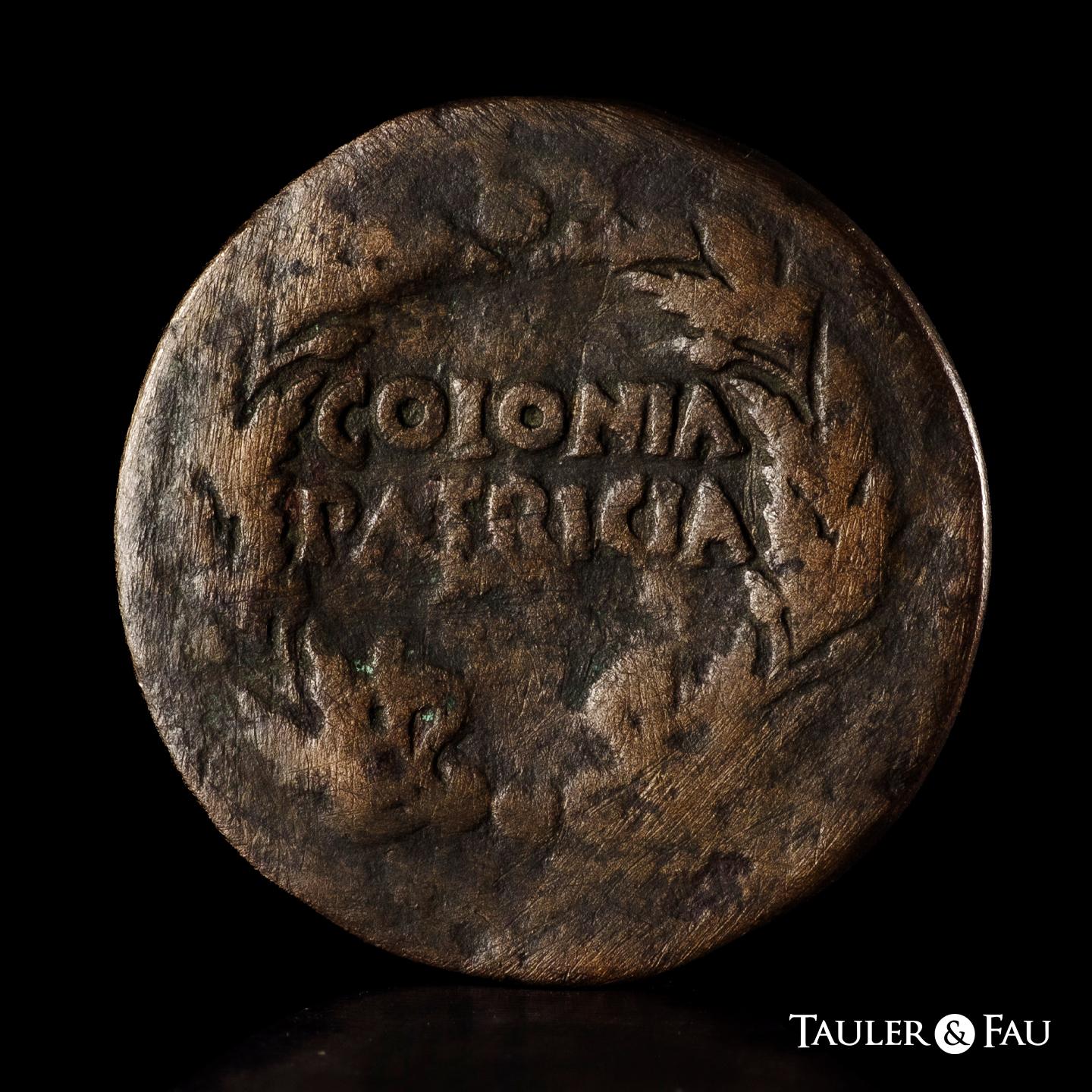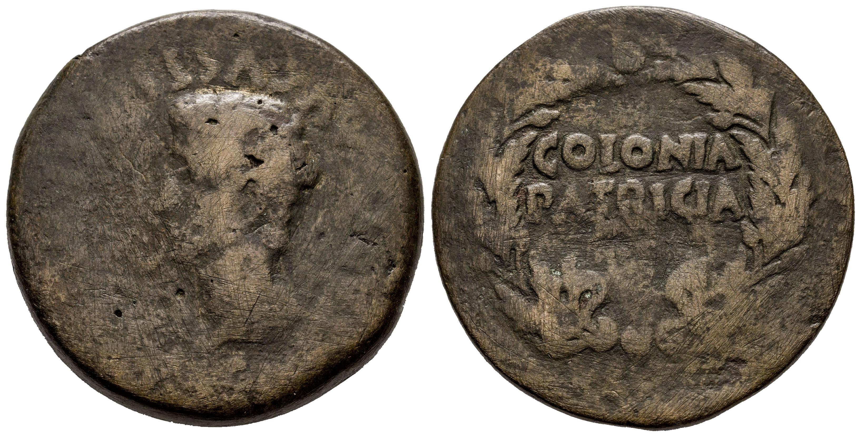 Colonia Patricia. Augustus period. Sestertius. 27 BC - 14 AD. Córdoba. (Abh-1987). (Acip-3355). Anv.: (PERMISSV. CAESARIS.) AVGVSTI. around head of Augustus left. Rev.: COLONIA. PATRICIA within laurel wreath. Ae. 39,57 g. Very rare. Almost F/F. Est...180,00.