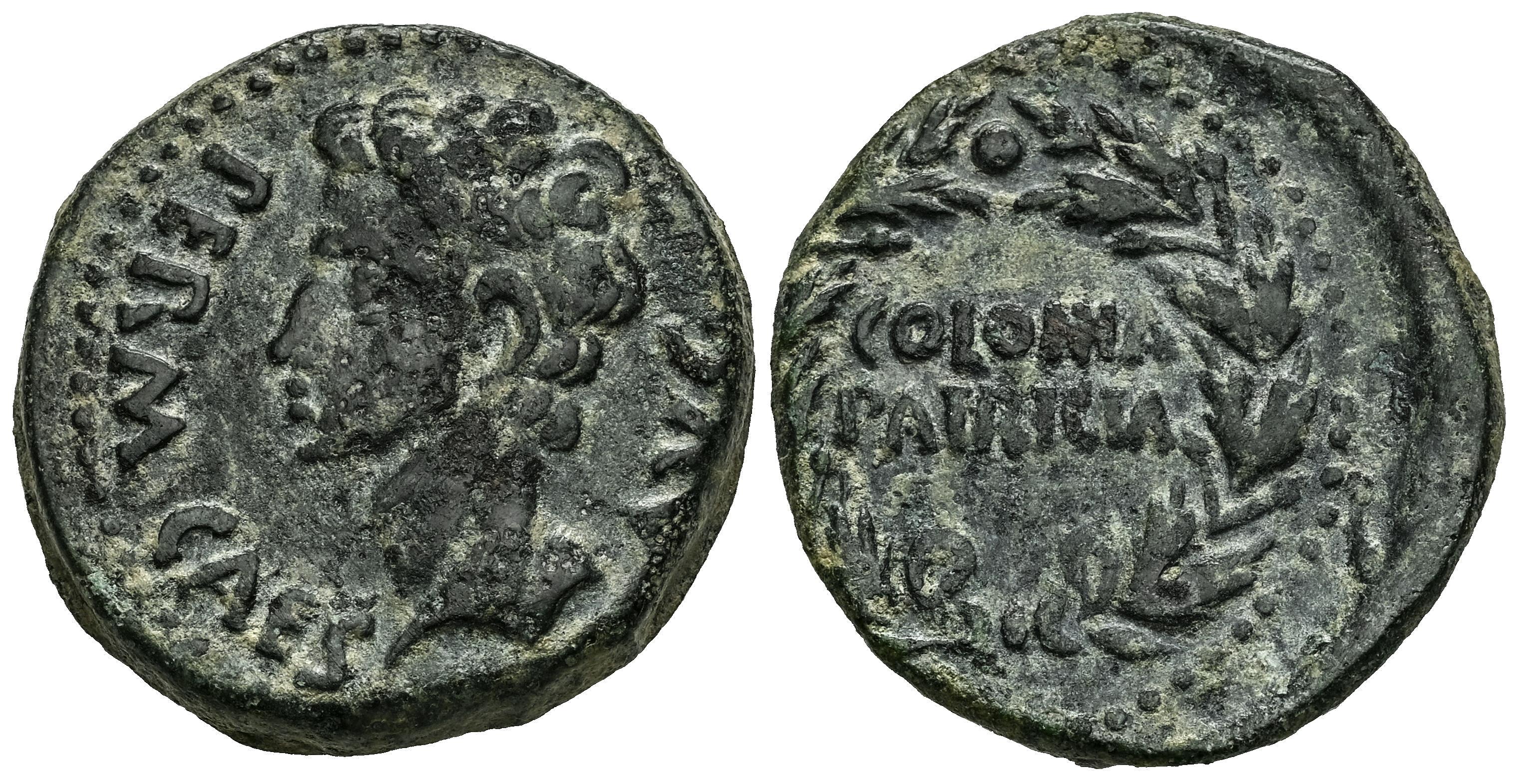 Colonia Patricia. Augustus period. Unit. 27 BC - 14 AD. Córdoba. (Abh-1989). (Acip-3357). Anv.: PERM. CAES. AVG. around head of Augustus left. Rev.: COLONIA. PATRICIA within laurel wreath. Ae. 11,97 g. Attractive specimen. Choice VF. Est...100,00.