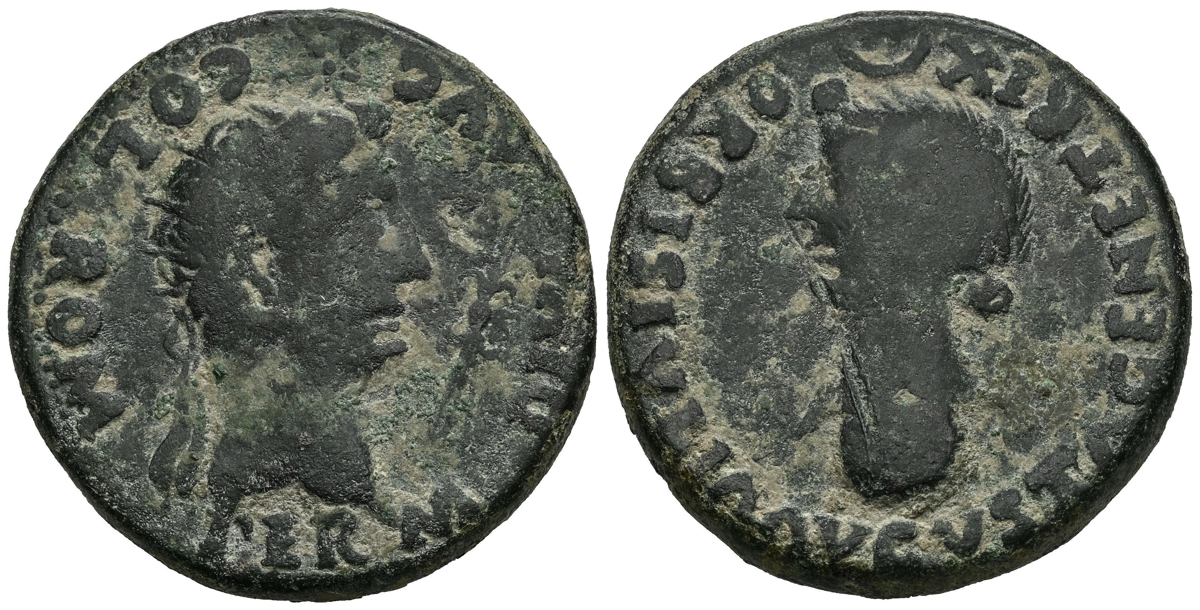 Colonia Romula. Time of Tiberius. Dupondius. 14-36 AD. Sevilla. (Abh-2014). (Acip-3360). Anv.: PERM. DIVI. AVG. COL. ROM. around radiate head of Augustus right, sheaf of rays before. Rev.: Head of Livia left, globe below, crescent above, IVLIA. AVGVSTA. GENETRIX. ORBIS around. Ae. 22,79 g. Almost VF/Choice F. Est...80,00.