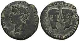 Colonia Romula. Time of Tiberius. Unit. 14-36 AD. Sevilla. (Abh-2016). Anv.: PERM. DIVI. AVG. COL. ROM. around laureate head of Tiberius left. Rev.: Heads of Germanicus and Drusus facin each other, legend CAESAR. GERMANICVS. CAESAR. DRVSVS around. Ae. 11,04 g. VF. Est...120,00.