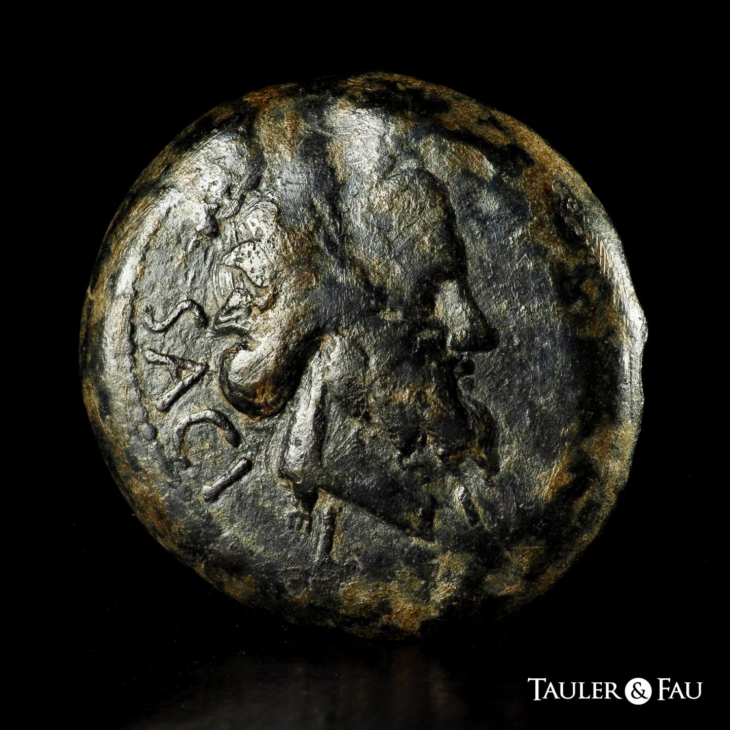 Sacili. Unit. 120-50 BC. Pedro Abad (Córdoba). (Abh-2019). (MIB-27/1 ID 119094, Plate Coin). (Acip-954). Anv.: Bearded head right, SACILI behind. Rev.: Horse walking right, below neo-Punic legend. Ae. 23,39 g. Ex J. Vico (12/11/1997), lot 67. Almost VF/Choice F. Est...150,00.