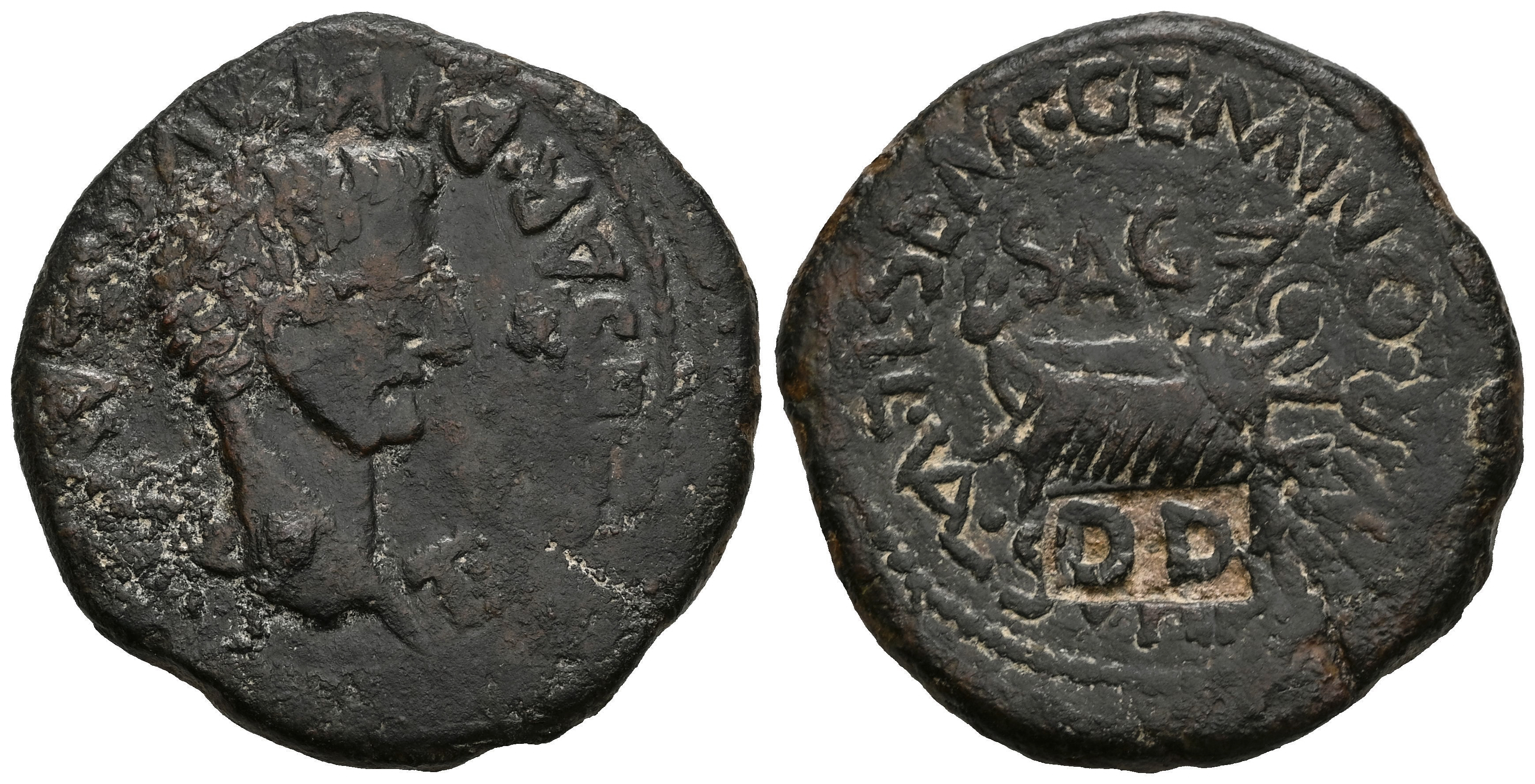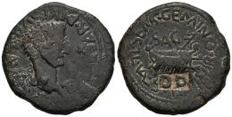 Arse-Saguntum. Time of Tiberius. Unit. 14-36 AD. Sagunto (Valencia). (Abh-2091). (Tesorillo-Type 4/30). Anv.: TI. CAESAR. DIVI. AVG. F. AVG. around head of Tiberius right. Rev.: Ship, SAG above, L. SEMP. GEMINO. L. VAL. SVRA. II. VIR around. Ae. 13,80 g. Countermark "DD" within rectangular cartouche on reverse. Almost VF/VF. Est...80,00.