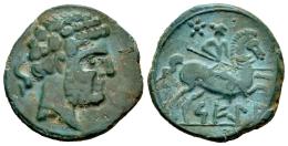 Sekia. Unit. 120-20 BC. Ejea de los Caballeros (Zaragoza). (Abh-2159). (Acip-1449). Anv.: Bearded head right, dolphin behind. Rev.: Horseman right, holding spear, star above, iberian legend SEGIA below. Ae. 8,29 g. Pleasant green patina. VF/Choice VF. Est...100,00.