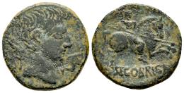 Segobriga. Unit. 30-20 BC. Saelices (Cuenca). (Abh-2182). (Acip-3240). Anv.: Male head right, dolphin before, palm behind, mejor arte. Rev.: Horseman right, holding spear, curved latin legend SECOBRIGA. Ae. 9,15 g. Almost VF. Est...180,00.