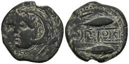 Sexi. Unit. 200-20 BC. Almuñecar (Granada). (Abh-2227). (MIB-11/23a). (Acip-819). Anv.: Head of Melkart left, with lion skin, club behind. Rev.: Two tunny right, punic letter alef above, pellet and crescent below; between them, punic legend in linear frame. Ae. 7,28 g. Scarce. VF. Est...120,00.