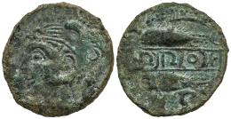 Sexi. Unit. 200-20 BC. Almuñecar (Granada). (Abh-2229). (MIB-11/22b). (Acip-820). Anv.: Head of Melkart left, with lion skin, club behind. Rev.: Two tunny left, punic letter alef above, punic letter teht? below; between them, punic legend in linear frame. Ae. 9,23 g. Slight rust. Scarce. Choice F/Almost VF. Est...100,00.