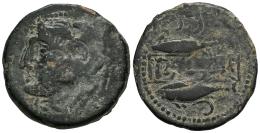 Sexi. Unit. 200-20 BC. Almuñecar (Granada). (Abh-2229). (MIB-11/22b?). (Acip-820?). Anv.: Head of Melkart left, with lion skin, club behind. Rev.: Two tunny left, punic letter alef above, punic letter teht? below; between them, punic legend in linear frame. Ae. 11,26 g. Struck over As of Gades (Abh-1339). Rare. F/Choice F. Est...70,00.