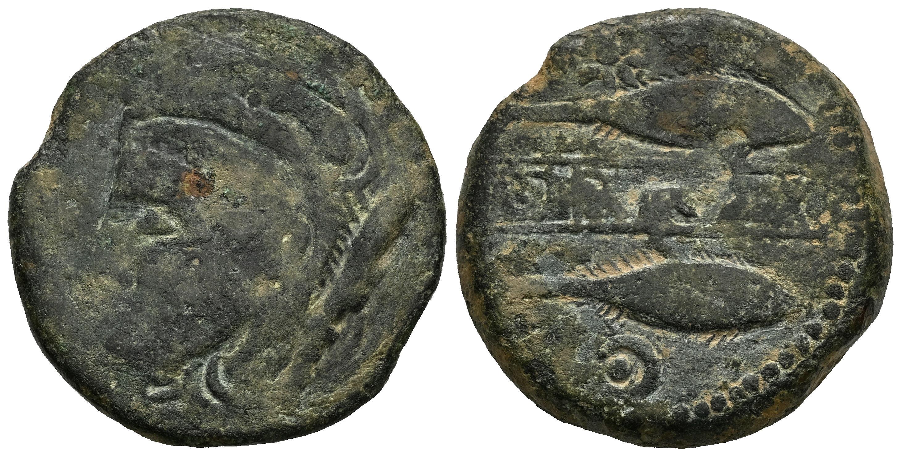 Sexi. Unit. 200-20 BC. Almuñecar (Granada). (Abh-2231). (MIB-11/21a). (Acip-814). Anv.: Head of Melkart left, mace behind. Rev.: Tunny right, punic legend between them, star above, pellet and crescent below. Ae. 11,31 g. F/Choice F. Est...50,00.