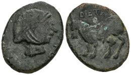 Sisipo. Half unit. 50-20 BC. Area of Andalucía. (Abh-2256). (MIB-209/4). (Acip-2501). Anv.: Helmeted male head right, SISIPO before. Rev.: Bull left, DETAV above. Ae. 7,79 g. Slightly tooled fields. Very scarce. Almost VF. Est...120,00.
