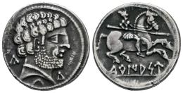 Turiasu. Denarius. 120-20 BC. Tarazona (Zaragoza). (Abh-2416). (Acip-1718 var.). (C-17 var.). Anv.: Bearded head right, iberian letters KA, crescent and TU. Rev.: Horseman right, holding spear, iberian legend TURIASU below. Ag. 3,96 g. Dark patina. Rare. XF. Est...150,00.
