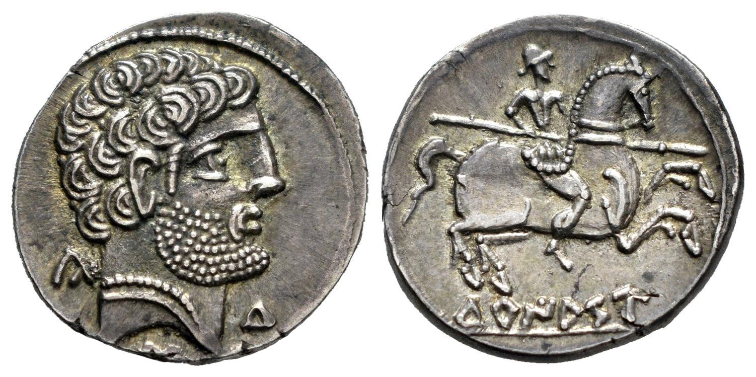 Turiasu. Denarius. 120-20 BC. Tarazona (Zaragoza). (Abh-2417). (MIB-109/22). (Acip-1722). Anv.: Bearded head right, iberian letter KA, S and TU. Rev.: Horseman right, holding spear, iberian legend TURIASU below. Ag. 3,48 g. Attractive specimen. Delicate patina. Lightly toned. Rare in this grade. AU. Est...400,00.