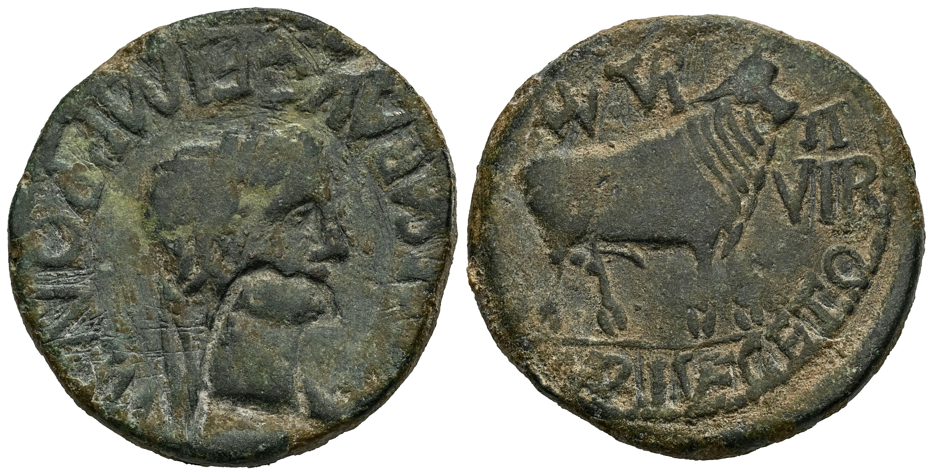 Turiaso. Augustus period. Unit. 27 BC - 14 AD. Tarazona (Zaragoza). (Abh-2450). (Tesorillo-Type 1/13a). Anv.: TI. CAESAR. AVG F. IMP. PONT. M. around laureate head of Tiberius right. Rev.: Bull right, M. PONT around, MVN. TVR above, VEGETO below. Ae. 12,89 g. Countermark "Legionary Eagle Head" to right on the reverse. Green patina. Cleaning hairlines. Almost VF/VF. Est...60,00.