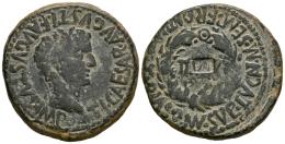 Turiaso. Augustus period. Unit. 27 BC - 14 AD. Tarazona (Zaragoza). (Abh-2455). (Tesorillo-Type 5/36). Anv.: TI. CAESAR. AVG. F. AVGVSTVS. IMP. P.P. around laureate head of Tiberius right. Rev.: II. VIR within laurel wreath, MAN. SVLP. LVCAN. M. SEMP. FRONT. MVN. TVRIASO around. Ae. 12,65 g. Countermark monogram "TVR" interpreted as an abbreviation of the mint TVRiaso itself, within a rectangular cartouche. VF. Est...100,00.