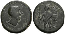 Ventipo. Unit. 150-50 BC. Casariche (Sevilla). (Abh-2517). (MIB-206/1). (Acip-2331). Anv.: Helmeted male head right. Rev.: Helmeted soldier left, holding shield and trident, legend VENTIPO to the right, letters NT interlace. Ae. 21,85 g. Faint scratches. Scarce. Almost VF. Est...150,00.