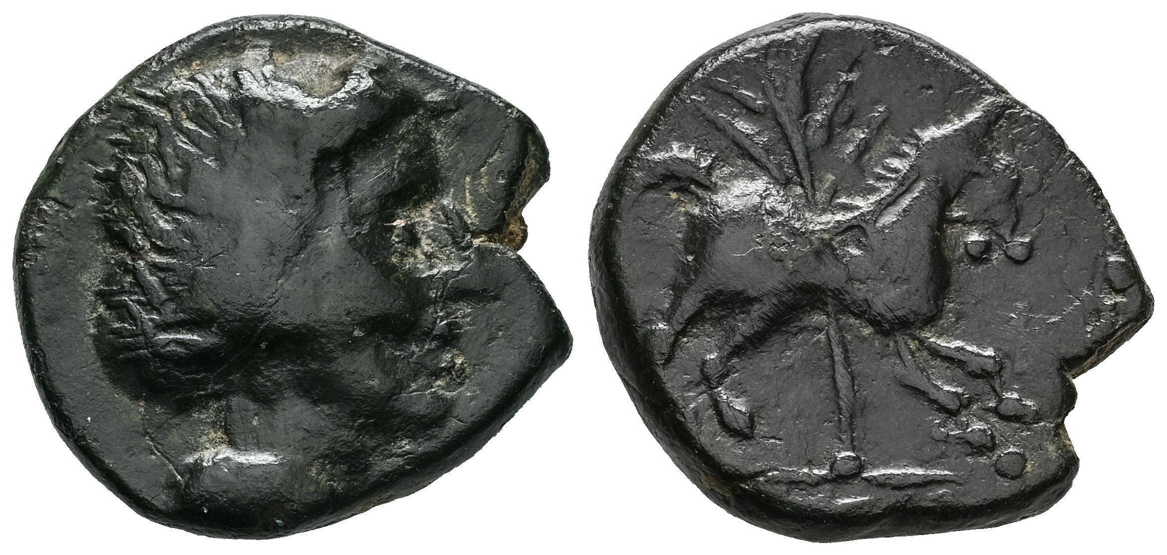 Uncertain Punic mints. Unit. 140-90 a.C. Lebrija (Sevilla). (Abh-Unlisted). (MIB-Unlisted). (Acip-Unlisted). Anv.: Laureate female head on the right. Rev.: Horse galloping to the right, behind palm, below Punic legend (´mgs`n). Ae. 6,55 g. The specimen we present exhibits an artistry and style that distinguishes it from all other known examples of this series. Typically, these issues feature a rougher, more careless style of artwork; however, this specimen displays a female bust with highly refined artistry, an atypical hairstyle, and its reverse, while more similar to those already known, is also of improved quality. Recent studies attribute this minted to Naprisan. VF/Choice VF. Est...180,00.
