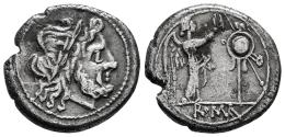 Anonymous. Victoriatus. 211 BC. Rome. (Craw-44/1). (BMCRR Rome-297/9). (Rsc-9). Anv.: Laureate head of Jupiter to right. Rev.: Victory standing to right, crowning trophy of arms; ROMA in exergue. Ag. 2,87 g. Choice VF/VF. Est...70,00.