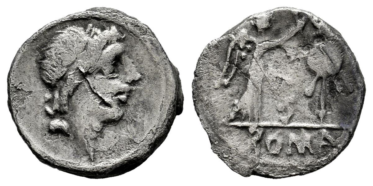 Anonymous. Quinarius. 81 BC. Rome. (Craw-373/1). (Sydenham-609a). (King-50). Anv.: Laureate head of Apollo right. Rev.: Victory standing right, crowning trophy; M between, ROMA in exergue. Ag. 1,69 g. Scratch on obverse. Choice F. Est...50,00.
