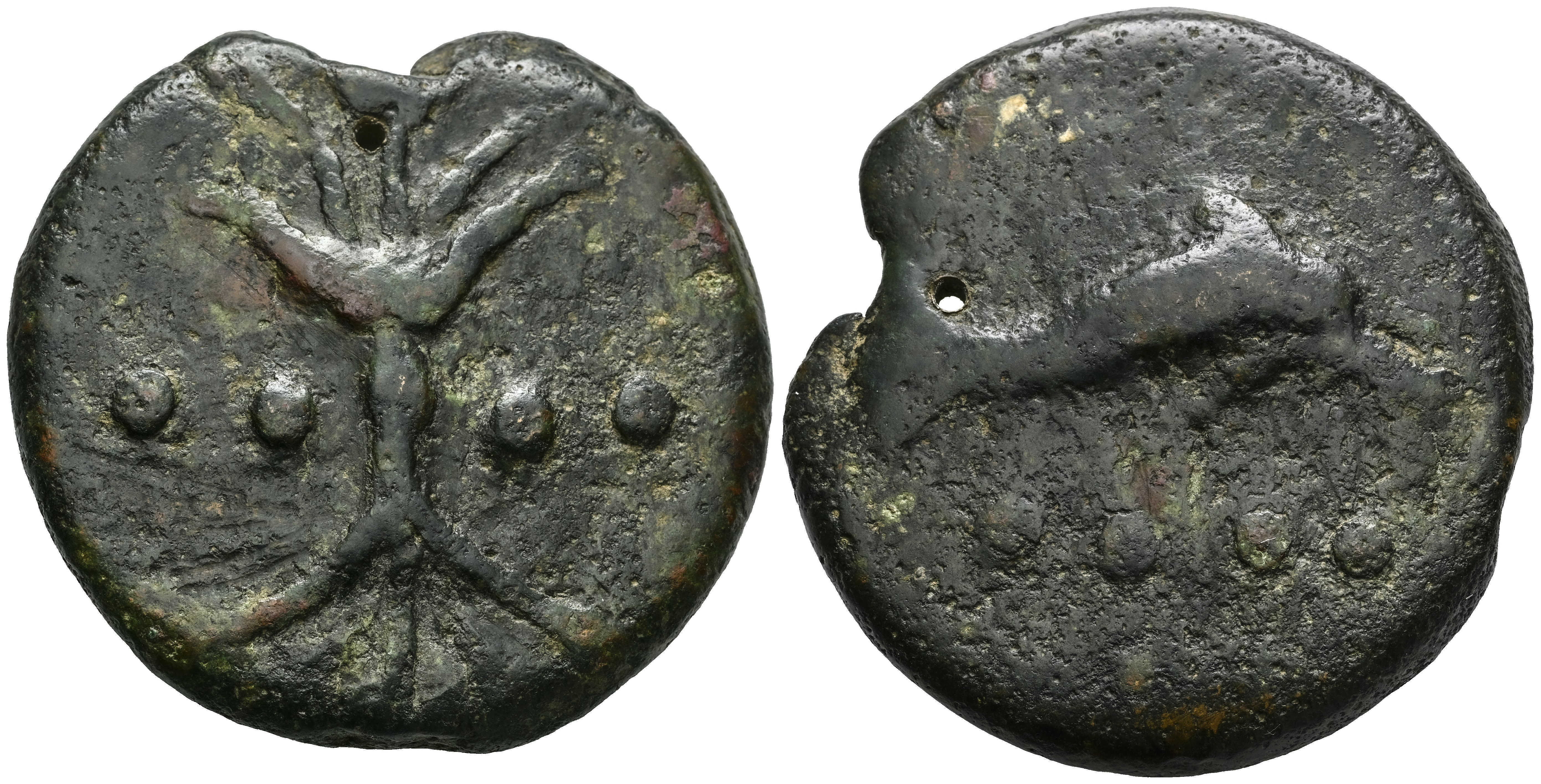 Anonymous. Aes Grave Triens. 280 BC. Rome. (Craw-14/3). (HN Italy-270). (Sydenham-10). Anv.: Thunderbolt; across field, four pellets (mark of value). Rev.: Dolphin swimming right; below, four pellets (mark of value). Ae. 98,04 g. Small hole. 47mm. Almost VF. Est...400,00.