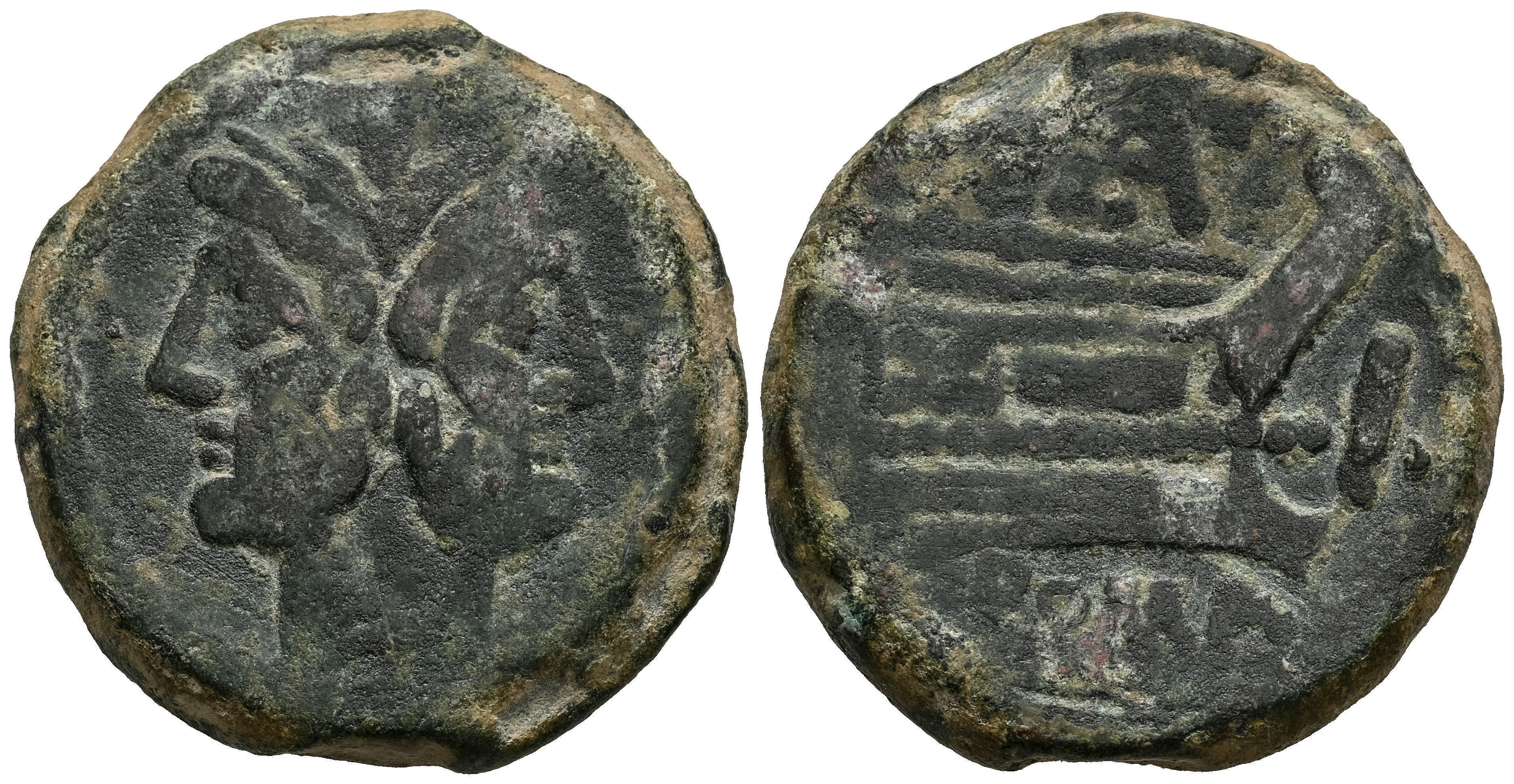 PAE Series. Unit. 169-158 BC. Rome. (Craw-176/1). (Sydenham-358). (RBW-742). Anv.: Laureate head of Janus; I (mark of value) above. Rev.: Prow of galley to right; PAE monogram above, I (mark of value) to right, ROMA below. Ae. 29,96 g. VF. Est...70,00.