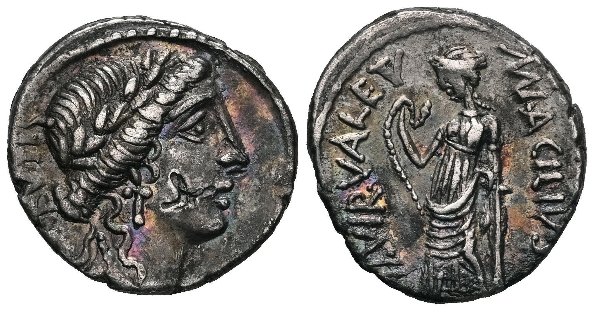 Acilius. Man. Acilius Glabrio. Denarius. 55 BC. Rome. (Ffc-96). (Craw-442/1a). Anv.: Laureate head of Salus right, SALVTIS upwards behind. Rev.: MN. ACILIVS III VIR. VALETV, (interlace MN and TV), Valetudo (Salus) standing left, leaning against column and holding serpent. Vertical and circular legend. Ag. 3,94 g. Countermark. Sligthly iridiscent tone. Almost XF/Choice VF. Est...120,00.
