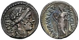 Acilius. Man. Acilius Glabrio. Denarius. 55 BC. Rome. (Ffc-96). (Craw-442/1a). (Cal-Acilia 8). Anv.: Laureate head of Salus right, SALVTIS upwards behind. Rev.: MN. ACILIVS III VIR. VALETV, (interlace MN and TV), Valetudo (Salus) standing left, leaning against column and holding serpent. Vertical and circular legend. Ag. 3,89 g. Countermarks on obverse. Some bluish patina. Traces of luster. Choice VF. Est...120,00.