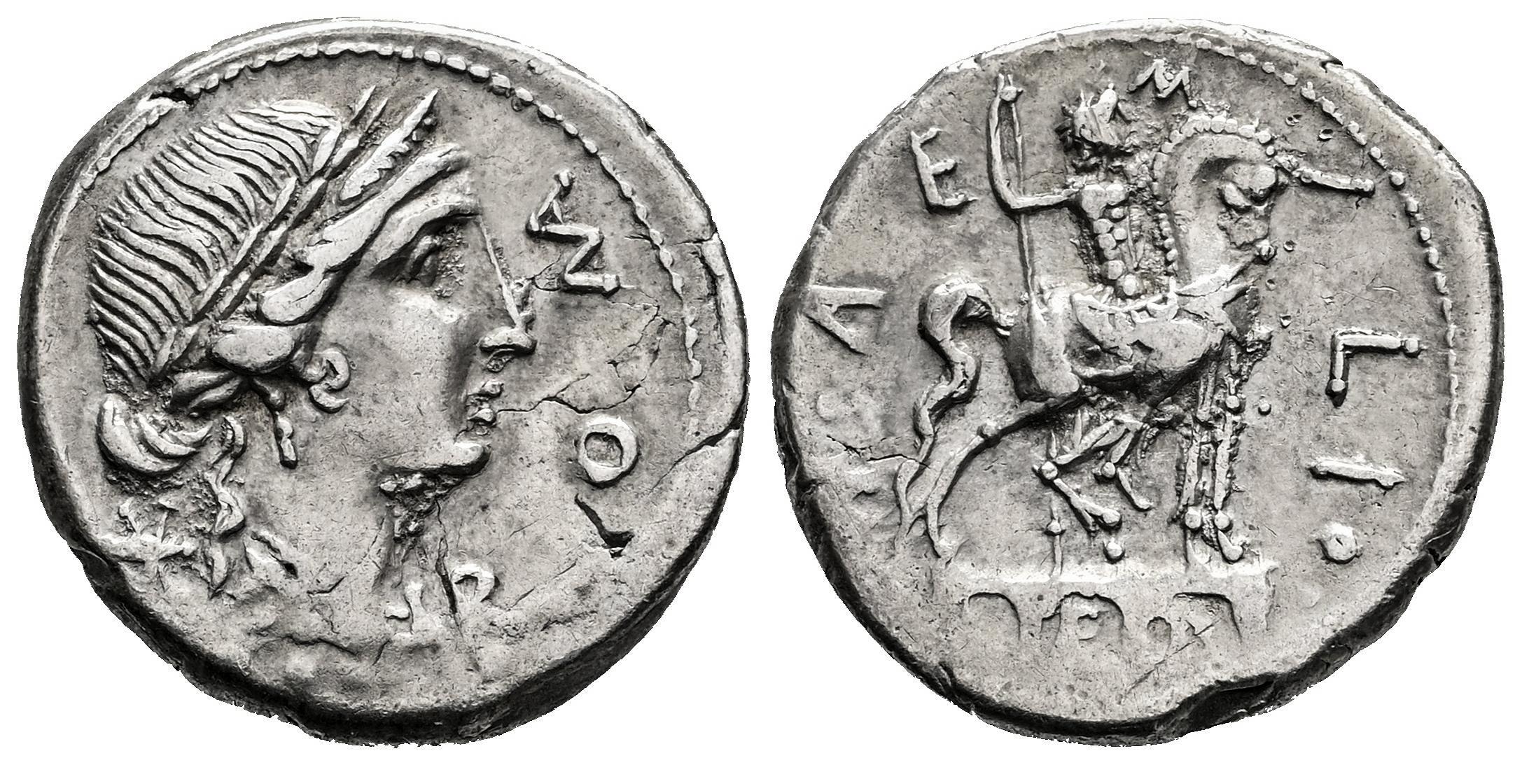 Aemilius. Man. Aemilius Lepidus. Denarius. 114-113 BC. South of Italy. (Ffc-103). (Craw-291/1). (Cal-73). Anv.: Laureate and diademed head of Roma slightly draped right ,ROMA (interlace MA) before, N behind. Rev.: MN. AEMILIO, (interlace MN), esquetrian statue on triumphal arch. LEP between the arches. Ag. 3,92 g. VF. Est...180,00.