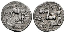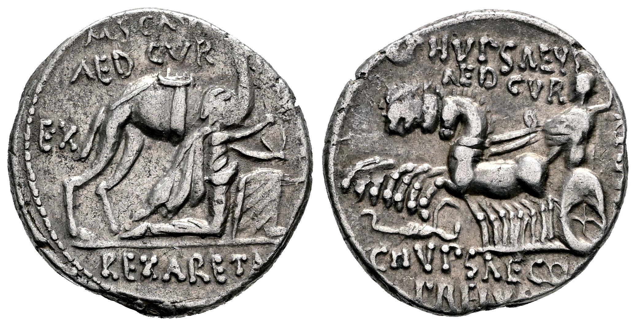 Aemilius. M Aemilius Scaurus y Pub. Plautius Hypsaeus. Denarius. 58 BC. Rome. (Ffc-123). (Craw-422/1b). (Cal-89). Anv.: M. SCAVR. / AED. CVR., above king Aretas kneeling beside a camel right, EX., on left, S.C., on right, REX. ARETAS., in exergue. Rev.: P. HVPSAE. / AED. CVR., above Jupiter in quadriga left, CAPTV., on right, but C. HVPSAE. COS. PREIVER., in exergue, scorpion below horses. Ag. 3,40 g. Ex Tauler&Fau 92 (28/09/2021), lot 1225. Choice VF. Est...120,00.