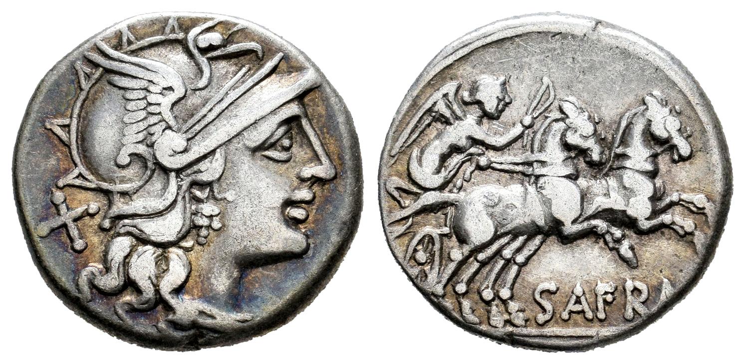 Afranius. Spurius Afranus. Denarius. 150 BC. Rome. (Ffc-133). (Craw-206/1). (Cal-112). Anv.: Head of Roma right, X behind. Rev.: Victory holding whip in biga right, SAFRA below horses, ROMA in exergue. Ag. 3,72 g. Sligthly iridiscent tone. VF. Est...70,00.